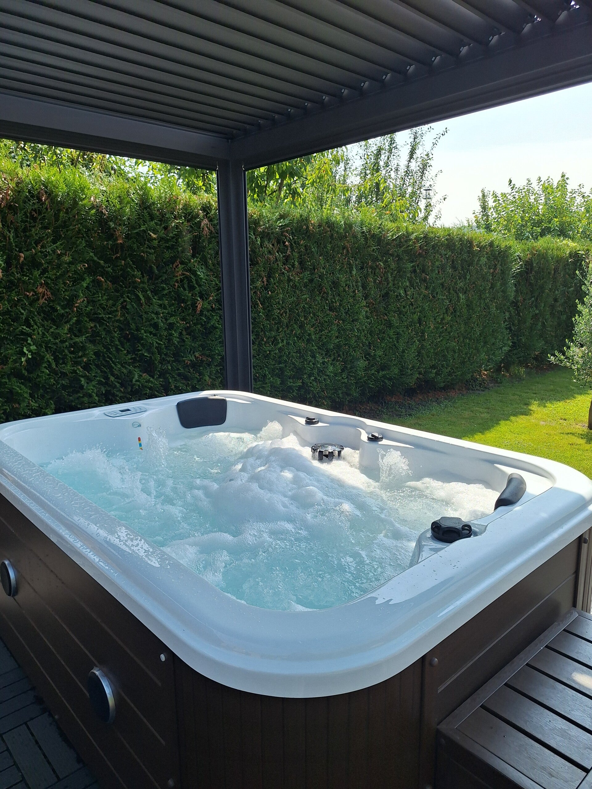 Vous préférez vous reposer en écoutant le bruit des oiseaux ou votre musique ? Notre jacuzzi extérieur possède des baffles intégrés pour vous détendre au soleil. La pergola est également refermable sur 2 côtés pour profiter de ce moment en toute intimité ! Disponible à partir de printemps 2026.