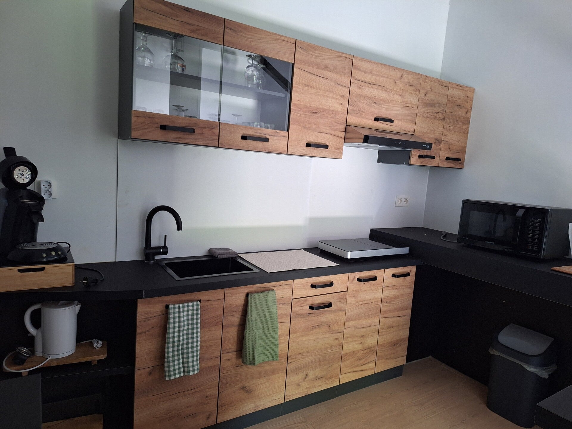Une cuisine équipée d'un four, de plaques de cuisson, d'un micro-ondes et d'un réfrigérateur.